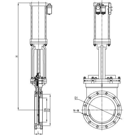 氣動刀形閘閥借助壓縮空氣驅動的閥門。氣動刀型閘閥簡單地說就是用氣動執(zhí)行器控制閥門,從而實現(xiàn)閥門的開和關。其可分為上下兩部分,上半部分為氣動執(zhí)行器,下半部分為閥門。本類閥門在管道中一般應當水平安裝。